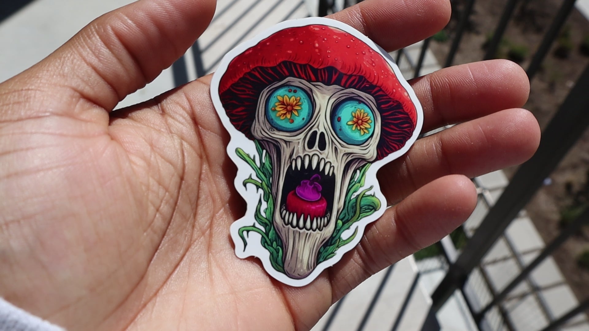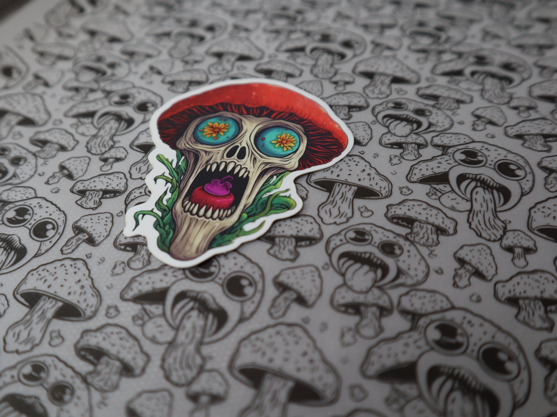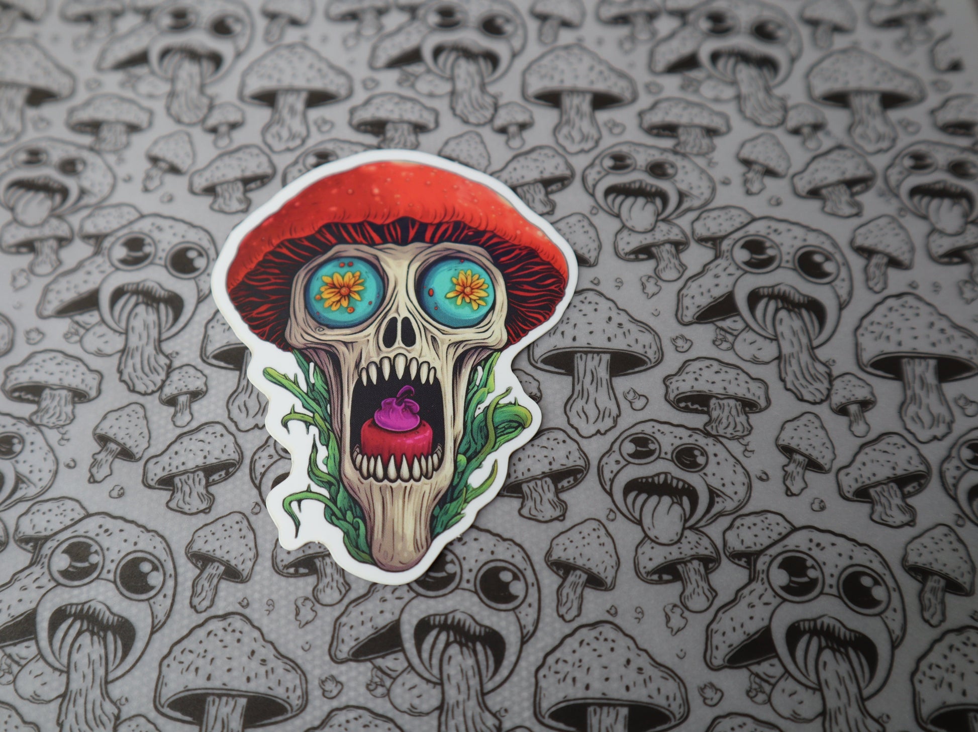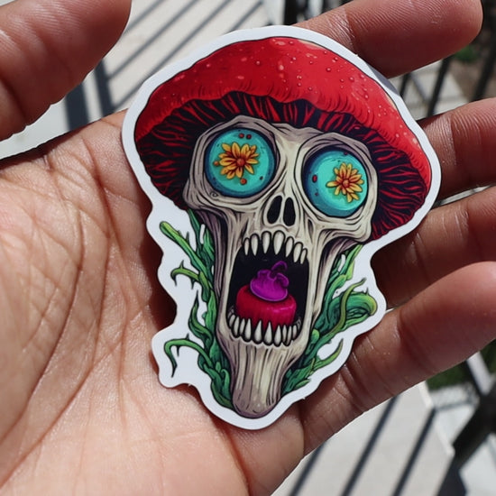 Celebrate Día de Muertos in true Shroomy Fusion style with Benito a.k.a. Beni one of our Day of the Dead Shroomlin stickers! This Shroomlin sticker captures a skull and mushroom cap design with details honoring this sacred holiday.